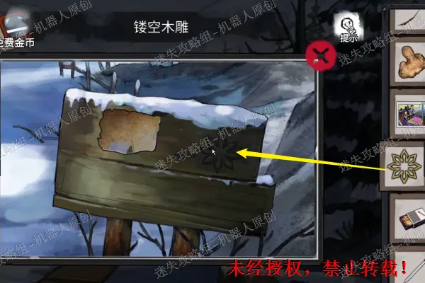 28、 将线卷以及鱼钩进行结合,得到新物品“绑着线的鱼钩”。再次回到树屋前面的雪地那边,将“滑块”放进去完成谜题之后(难度很小只需要将滑块移动到对应位置就可以),得到“雪鞋”,同时使用“剪刀”将袋子剪开得到物品“浮雕”。28.128.2