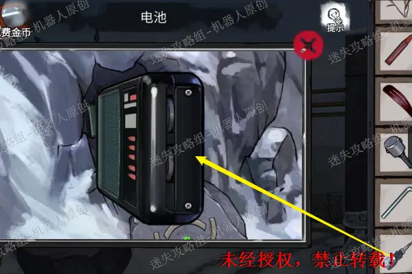48、 再次回到围墙的外面,查看石洞里面的收音机。使用“螺丝刀”将电池盖打开,得到“电池”。48.1