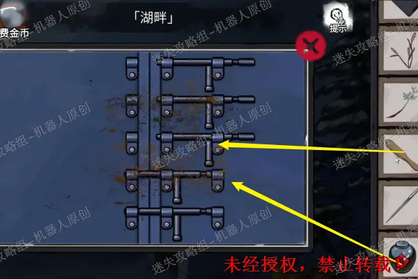 40、 回到围墙外使用手套扒开右下的荆棘。得到“半把钳子”。将两个半把钳子进行结合,之后得到新物品“钳子”。之后回到湖畔使用新的物品“钳子”将左边的铁丝网给剪开,之后进入湖面。如图所示查看湖面上的红色包袱,之后按照下面如图所示的位置完成谜题,成功之后再次得到“浮雕碎片”。40.140.2