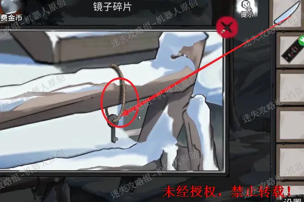 2、 之后查看大树下面的雪,发现打火机,将它收集起来。之后使用刚才在镜子上面得到的碎片来将栏杆上面的绳子给弄断。得到一个比较关键的物品钥匙。2.12.2