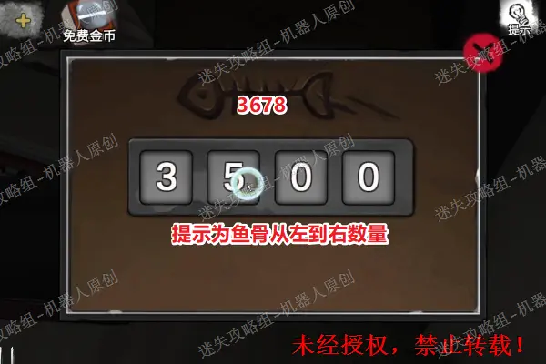 19、 查看窗边类似于鱼骨的装饰物,根据上面的从左到右边的鱼骨数量,可以得出密码为3678。之后回到木屋里面,查看二楼的床铺,输入上面的密码之后将盒子打开,拿到物品“针筒。”19.1