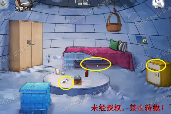 50、 回到雪屋,之后使用“镶嵌物”将衣柜里面的盒子打开,得到新的物品“齿轮”之后点击查看雪屋中央的桌子,将饼干盒子打开。之后移开饼干,拿走“发夹”。50.1