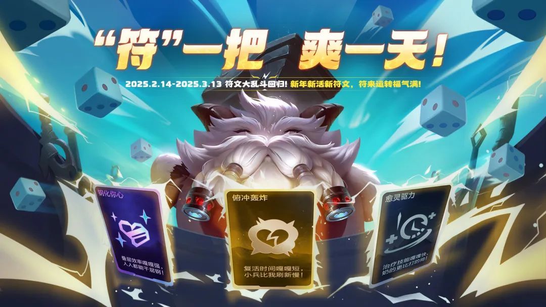 “符” 气爆棚,欢乐开团!2月14日(明日)0:00起,截止至3月13日,符文大乱斗回归,多种全新符文为战斗添彩!新的一年,来一场刺激对战,让好运随符文一同流转!