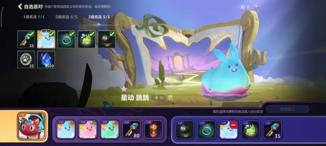 在「自选派对」中,召唤师可自由选择11个奖品构建自己的派对奖池,其中可选择1个1级奖品、5个2级奖品、5个3级奖品。选择快速填入会随机选择未拥有的物品填入空白奖池,开启本轮派对后奖励不可替换。
