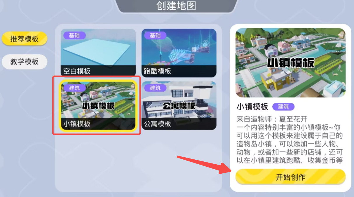 点击【造物岛】-【开始建造】后进入模板选择页面选择指定模板——小镇模板进行补充和拓展。地图模板仅为参考内容,只需要在主场景不变的基础上,对地图内的玩法内容进行拓展即可,比如小镇躲猫猫、小镇射击、小镇收集、小镇剧场演绎、小镇节日盛典等选题均可。