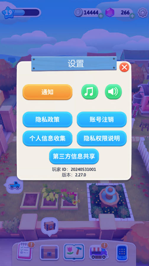 园主可以在这里打开通知,调整游戏内音效音乐,获得帮助等,你的游戏id也在这里可以找到噢。游戏内无昵称设置与头像设置。