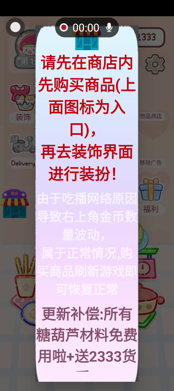 更新新的装饰和圣诞糖葫芦!! 「你进行草莓糖葫芦吃播的话,我就赞助100元。」 「脆口的声音太迷人了(°θ°)」 由于客人都被最近新开的许多糖葫芦店家抢走,曾经号称糖葫芦达人的父母因此卧病在床。 继承父母店面的主角露露开始糖葫芦吃播来宣传店面。 直到成为真正的糖葫芦达人那一天! 「今天我也要开始糖葫芦直播罗!( •o• )」 [串材料] 只有新鲜的水果的话,很难以一名吃播实况主存活下来。还要有松饼、地球软糖、青阳辣椒!利用奇特的材料制作糖葫芦吧。 [裹糖衣] 将材料串满竹签的话,就放进锅子搅动吧。唯有利用达人的秘法,才能裹出又薄又脆的糖衣。 [即时吃播] 咔哒咔哒!今天的吃播也大成功。热烈的聊天内容看起来反应也不错。看来得利用完成观众任务得到的赞助金来买新材料了! 来,准备好了吧?现在就马上挑战成为糖葫芦达人吧!