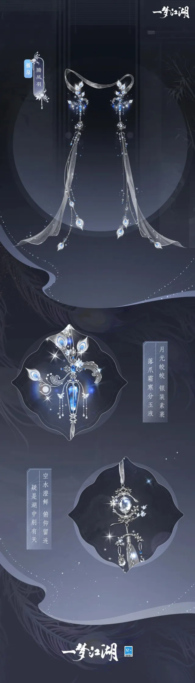 全新稀世披帛·腾凤羽以月下展翅的孔雀为灵感设计而成,采撷洒落于碧波浪涛之间的月色、月下飞舞的粼粼浪花与晶莹剔透的水珠,制成了薄如蝉翼的丝帛飘带与其间连接孔雀翎羽的华美装饰。