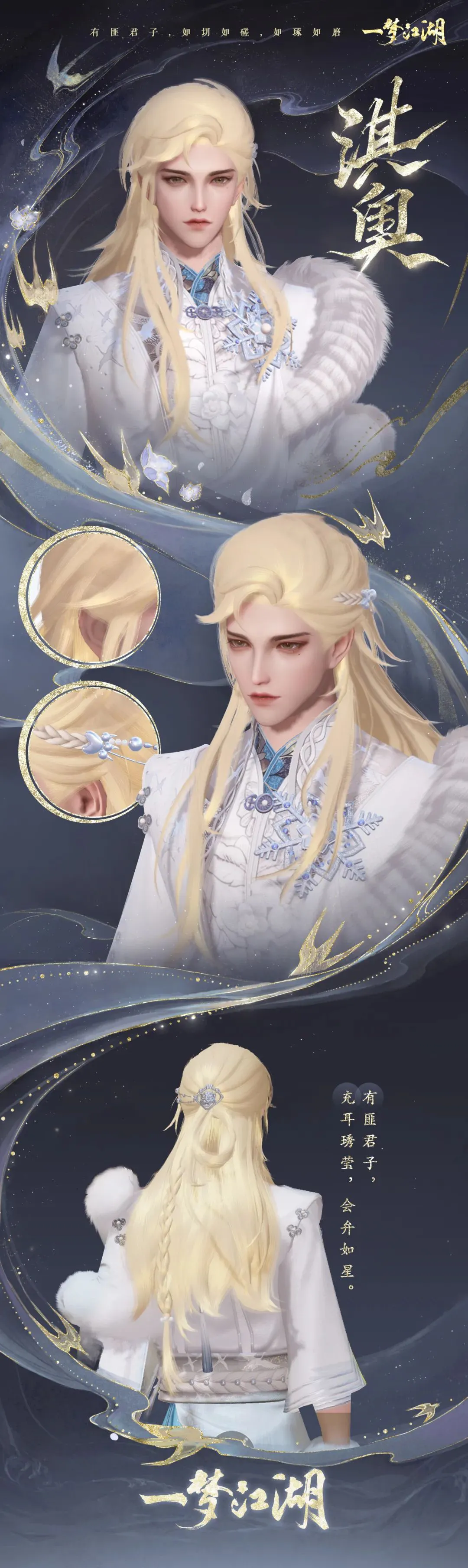 云锦楼大师傅近日前往淇水之畔采风,见一人金发如瀑,又见冬日细碎的阳光照在水面上,泛起金色的粼粼波光。大师傅将华丽金发取名为“淇奥”,希望拥有这款发型的人也能拥有真君子般令人难忘的美好品德。