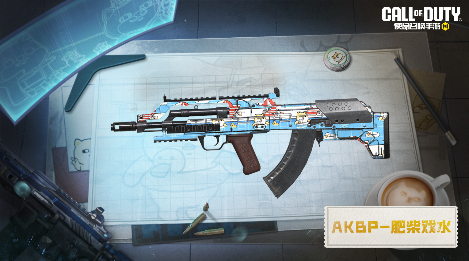 AKBP-肥柴戏水以清爽的淡蓝色为主色调,给人清新脱俗的感觉。同时,硬朗的枪身线条与小肥柴戏水的可爱画面形成反差萌,让人爱不释手。