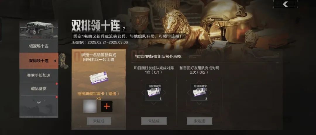 活动期间,先锋们绑定1名暗区新兵或流失老兵,与他组队开局,可领取枪械典藏十连抽!