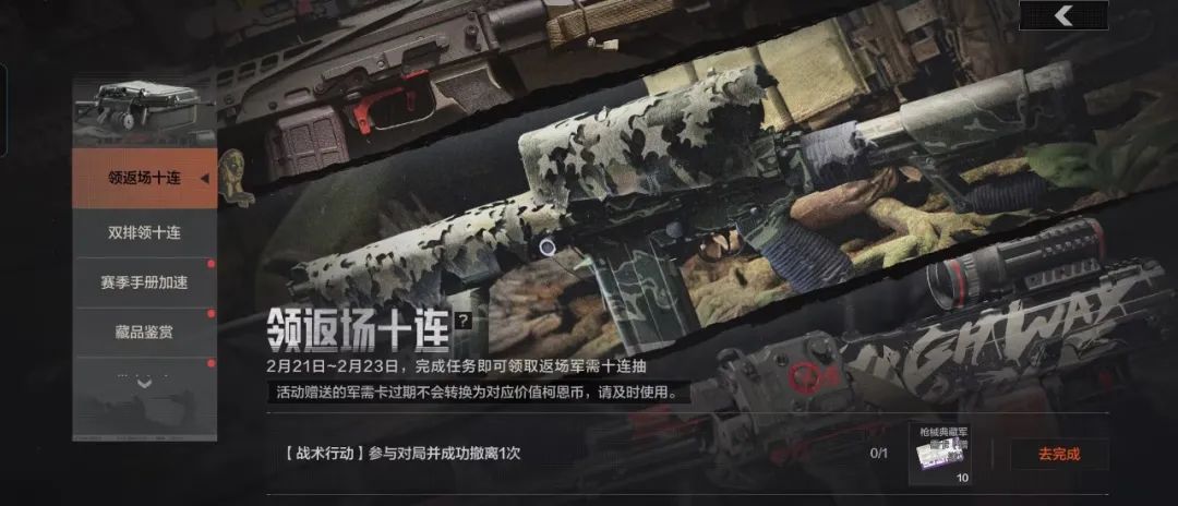 活动期间,先锋们参与战术行动并成功撤离一次,即可领取返场军需十连抽!
