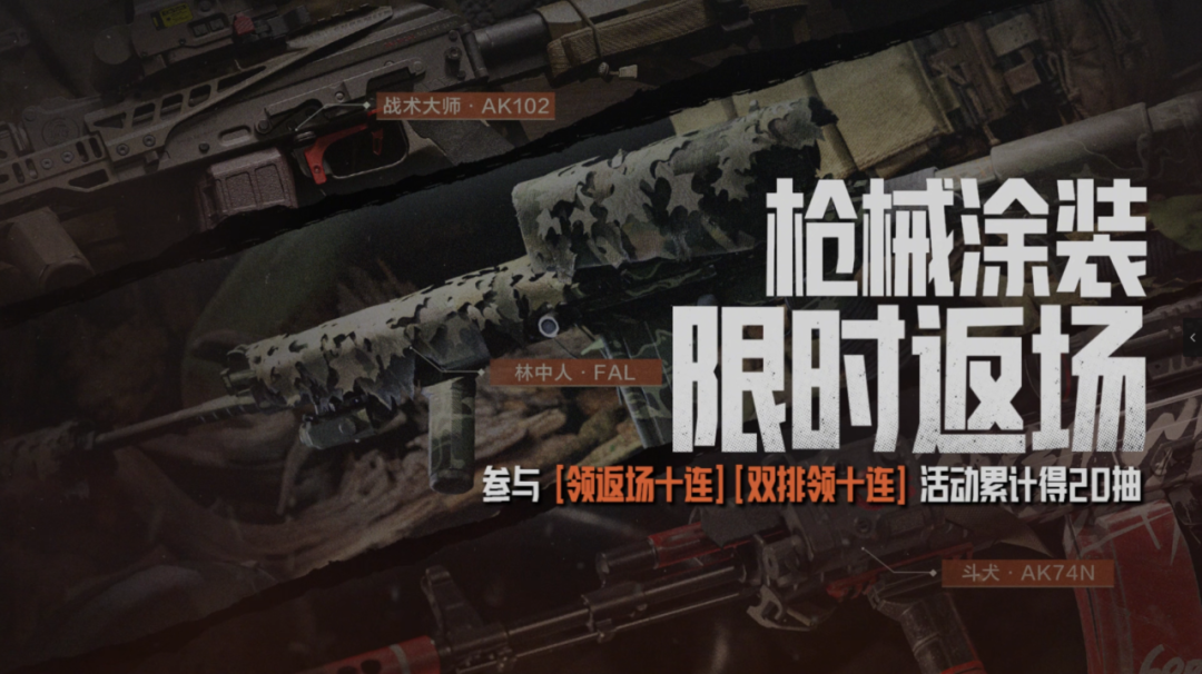 参与【领返场十连】、【双排领十连】活动累计可得20抽枪械典藏军需卡!