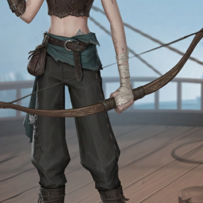 随身携带的木弓由沉船的龙骨打造而成,弓身刻有家族流传的神秘符文,她的族人相信这些铭文能赋予他们力量。