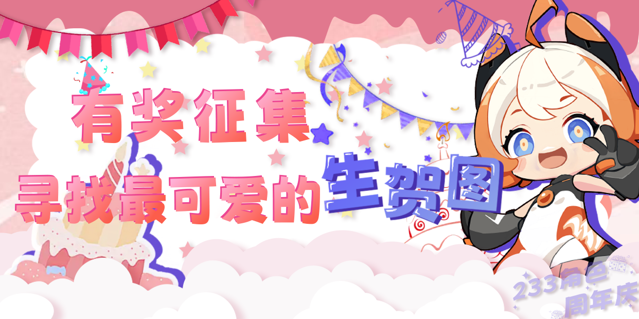 1.请你以233娘为主角,结合生贺图的主题进行绘画。无论是233娘的生活场景还是Q版可爱大头照都可以哦!画风不限、绘画形式不限!