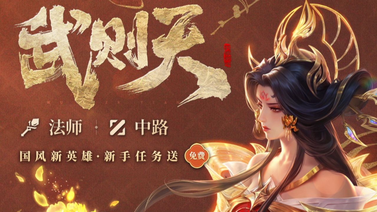 这是游戏《决胜巅峰》的相关内容,宣传英雄武则天可免费获取,还展示了武则天的英雄形象、技能特效,介绍其为法师定位,具备持续伤害与团控能力,同时探讨该英雄的设计表现与战斗强度。