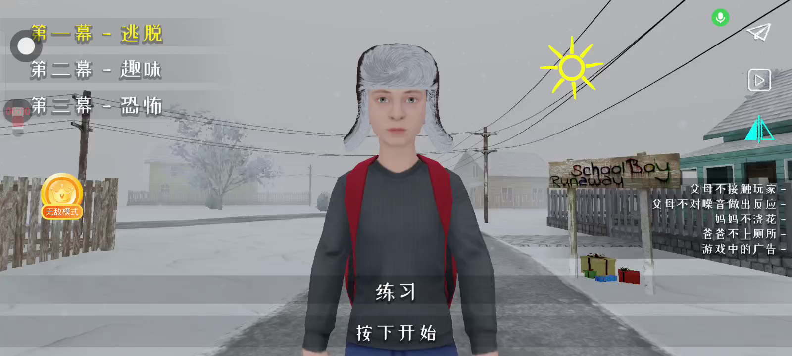 12月30日最新版本0.453已更新~ 【更新内容] 新模式:水平镜像模式。 错误修复。 【如何设置中文】 进入游戏后-点击右上角暂停-点击中间的设置按钮-点击English-选择中文-即可设置中文 游戏目前只解锁第一章~后续章节正在开发中~ “啊,你这个流氓!快点学习!”父母这么说着并把你软禁起来。试着比你的父母更聪明,找到与你的朋友一起出去玩的方法。 沉浸在一个因在学校成绩不好而受到父母惩罚的小学生的角色中,尝试在不被父母发现的情况下逃出家门。 关键机制: - 3D 第一人称游戏。 - 潜行,隐藏,不要被抓住,也不要发出声音! - 拼图,解决谜题,寻找物品来计划你的逃生。 - 小心,父母可能会注意到打开的柜子和门。
