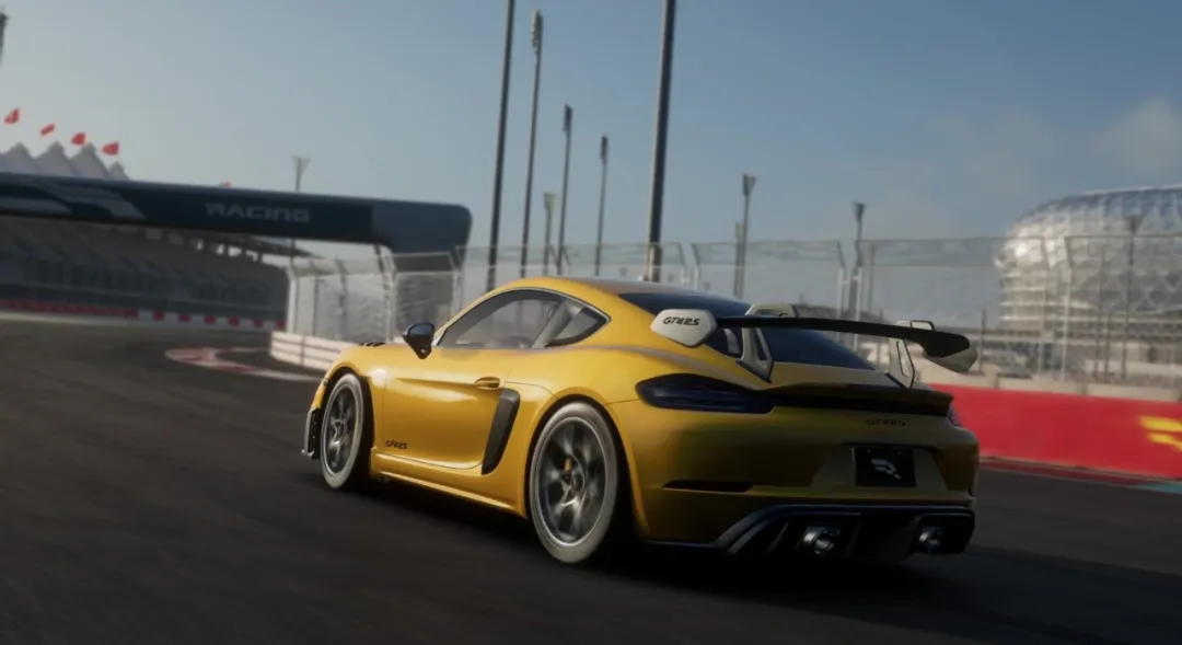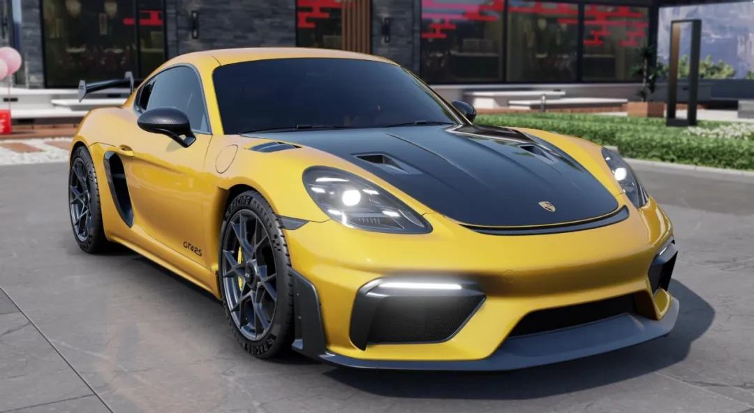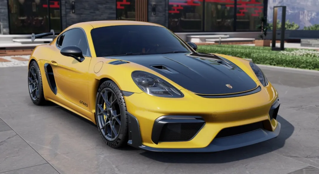 保时捷 718 Cayman GT4 RS '22 身披竞速黄拼接涂装,在阳光下闪耀着耀眼的光芒,每一个细节都散发着强烈的运动气息和赛道基因。