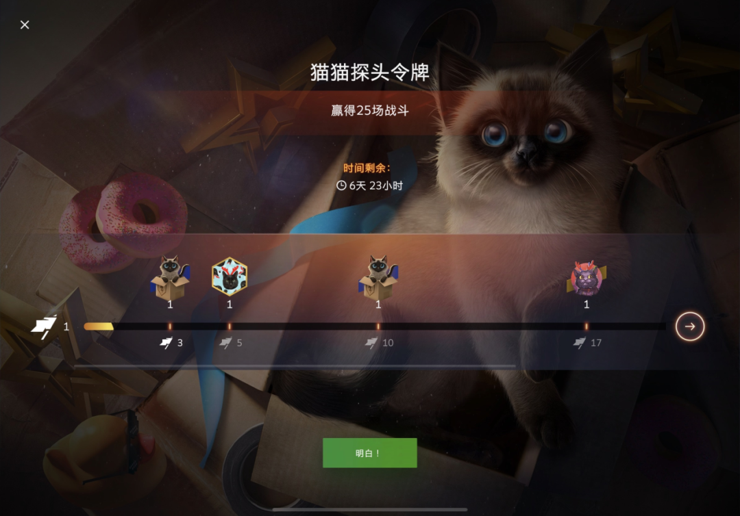 嘘...你听到猫猫的叫声了么?听起来这些小家伙在我们的收纳箱里安家了!也不稀奇,毕竟收纳箱里温暖舒适,更是完美的庇护所。成为猫猫们的伙伴,把它们叫出来亮个相吧!接受这个不小的挑战,参加活动,收集猫猫探头代币,赢取包含收藏坦克在内的超棒奖励!