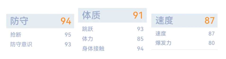防守意识+11 抢断+10 身体接触+10 跳跃+10