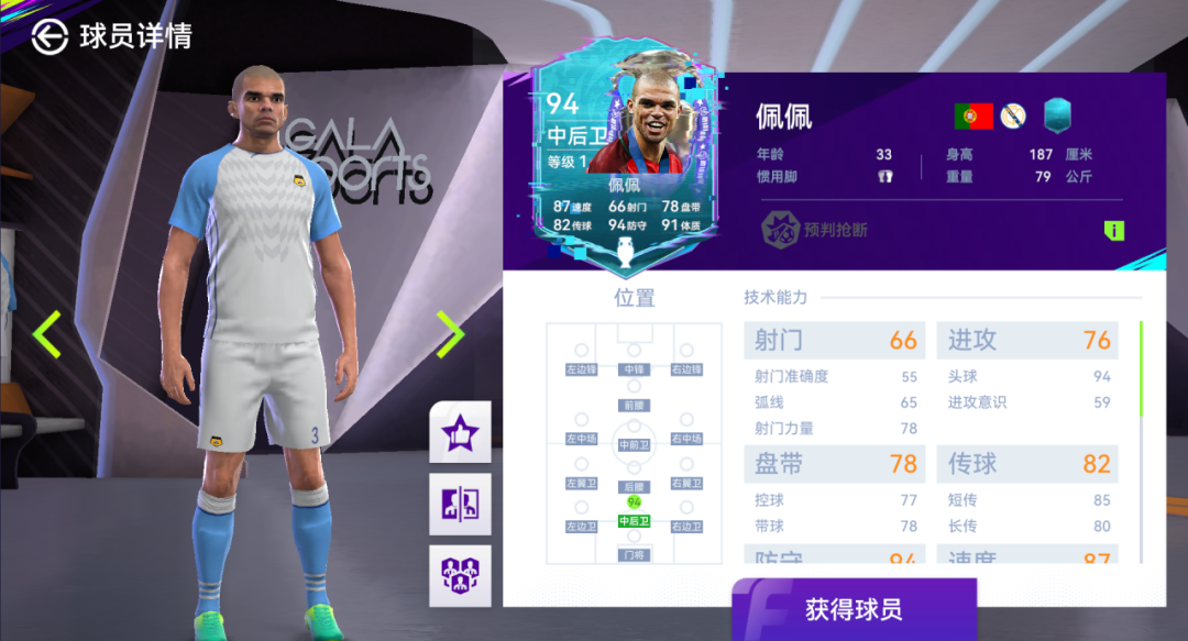 94分的防守属性,代表着佩佩用南美街头的野性淬炼出的欧洲顶级防守技艺!巅峰期场均抢断3.1次,成功率高达78%。凭借对传球路线的恐怖预判,皇马生涯场均拦截2.9次。3座欧冠冠军、2座西甲冠军、2016欧洲杯冠军,4次入选欧足联年度最佳阵容,防守端的统治力是团队荣耀的基石。只要佩佩在场,你的防线永远安安全全!