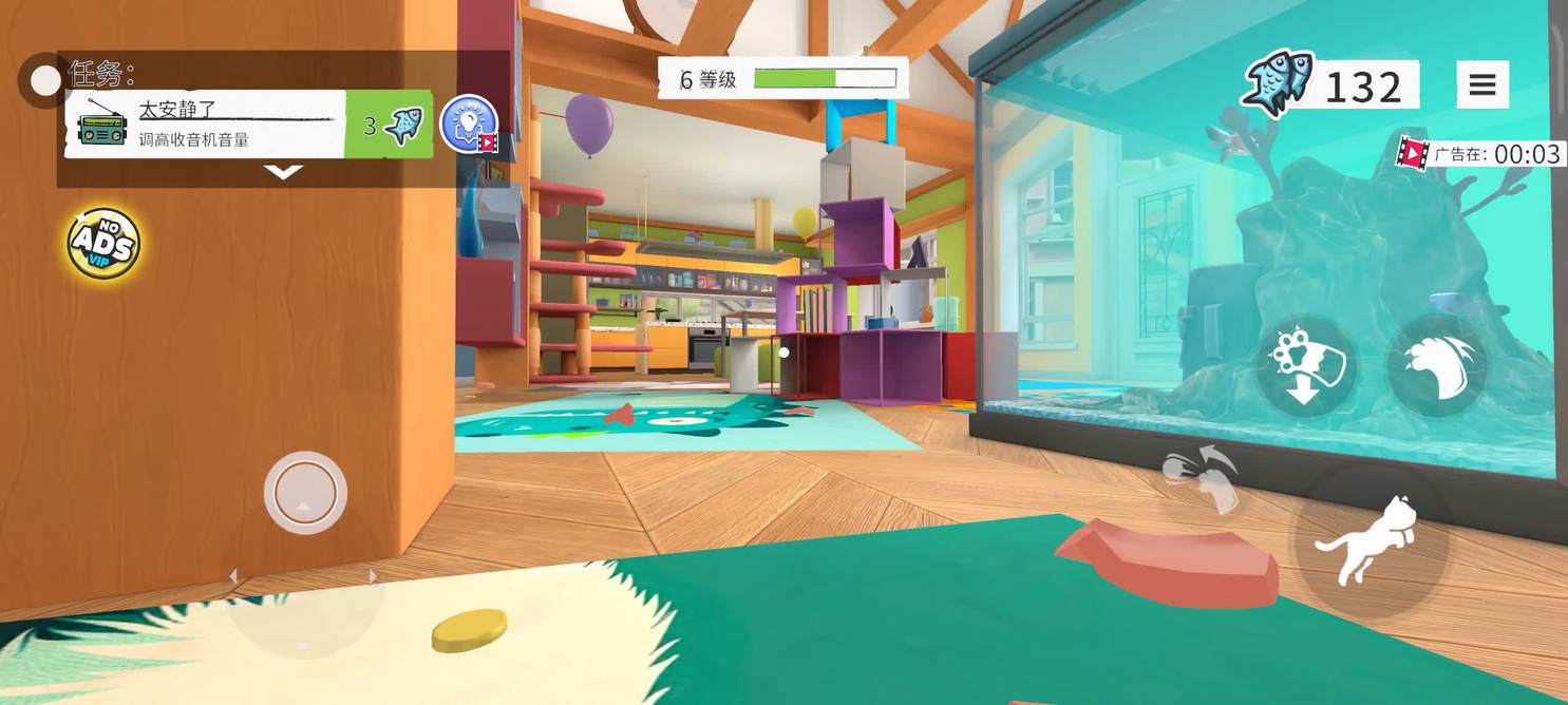 这是某猫咪模拟游戏的6等级任务界面,玩家当前需完成“打碎存钱罐”任务,完成可获得7个鱼形奖励道具,可在布置丰富的房间场景中操控猫咪行动。