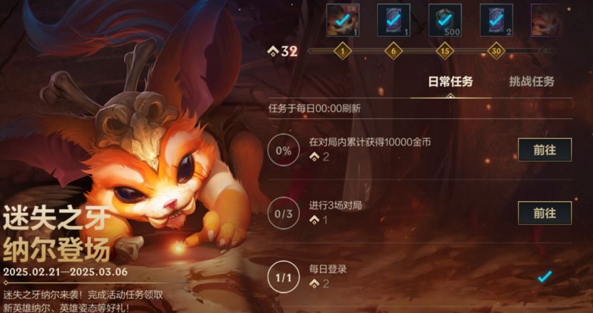 迷失之牙 纳尔来袭!截止至3月6日,召唤师完成活动任务即可领取新英雄迷失之牙 纳尔、英雄姿态-明眸、传奇图集卡包和集萃晶石*2000等好礼~