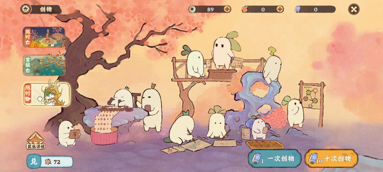 我们体验游戏后不久就可以解锁抽卡功能啦(创物),我们可以抽到给福来的装扮,和可以放在萝萝山上的好看建筑。但我们可以先不抽,因为前期抽这些是没什么用的,首先可能建筑过少,很难摆设好看,装扮过少,有些装扮可能不好搭配。其次前期只能自己看看,也不会有很多人特地来看。所以不如把游戏理解提高、游戏等级提高,当那时,就不用把太多时间去投入建设萝萝山了,可以去串门,展示自己,这时,我们攒的抽建筑和抽装扮的卷轴也有很多,可一次性抽超多次。