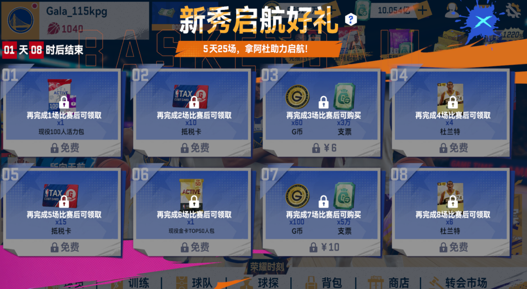 解锁所有前置任务,可以获取63张新秀杜兰特典藏金卡、还有抵税卡*95、1120G币、43W支票、现役金卡TOP50人包*4、全额中产卡*30、降薪引援卡*15、老将底薪卡*20!
