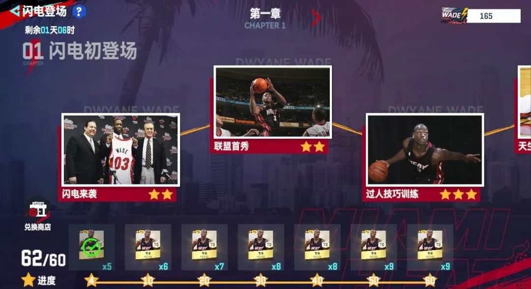 完成韦德限时关卡【闪电舞步】球星挑战PVE活动,回顾韦德新秀生涯,即可兑换满突新秀韦德收藏金卡。