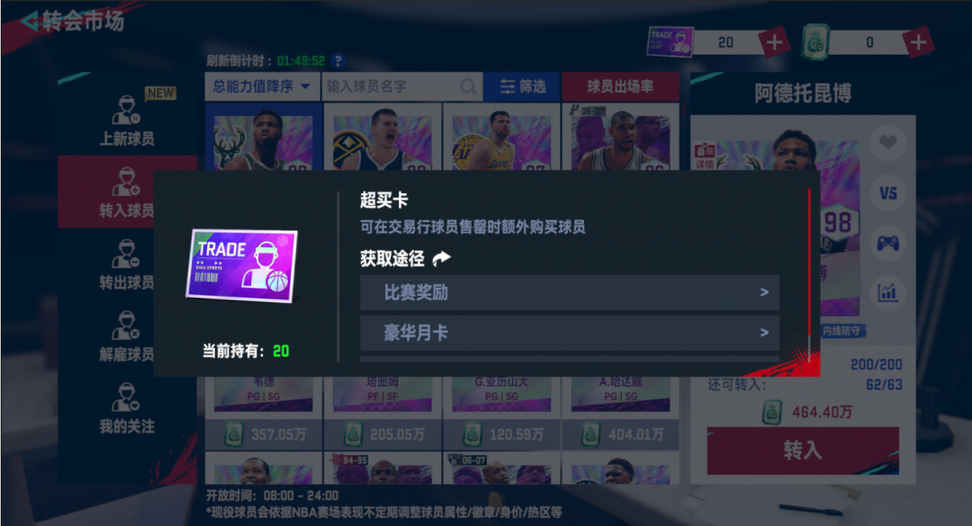 超买卡可以在转会市场球员售罄时额外购买球员(BOSS们可以从豪华月卡、天梯赛周胜场奖励、月签到活动中获取)
