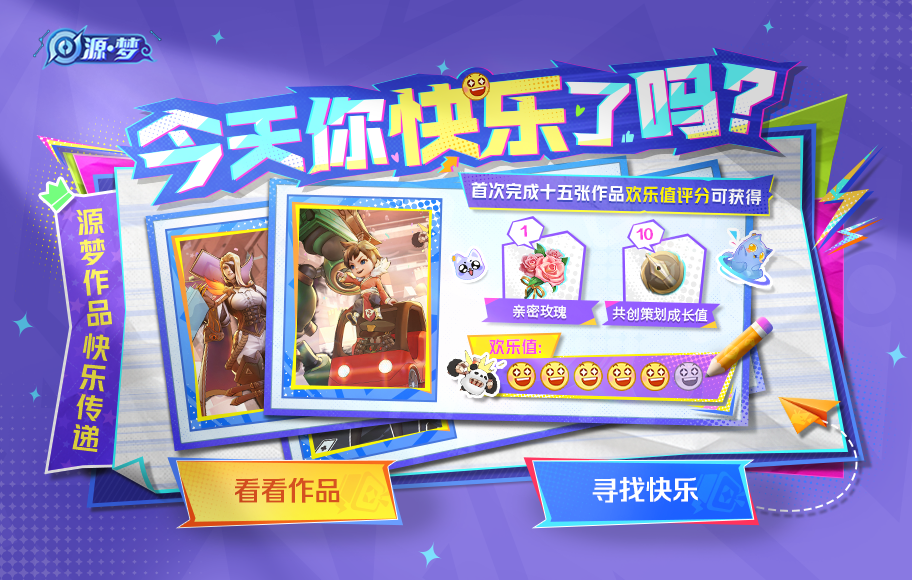 【源梦快乐集】活动正在逐步开启中,召唤师们可以登录游戏为源梦作品进行欢乐值评分,同时还能分享有趣作品传递快乐~
