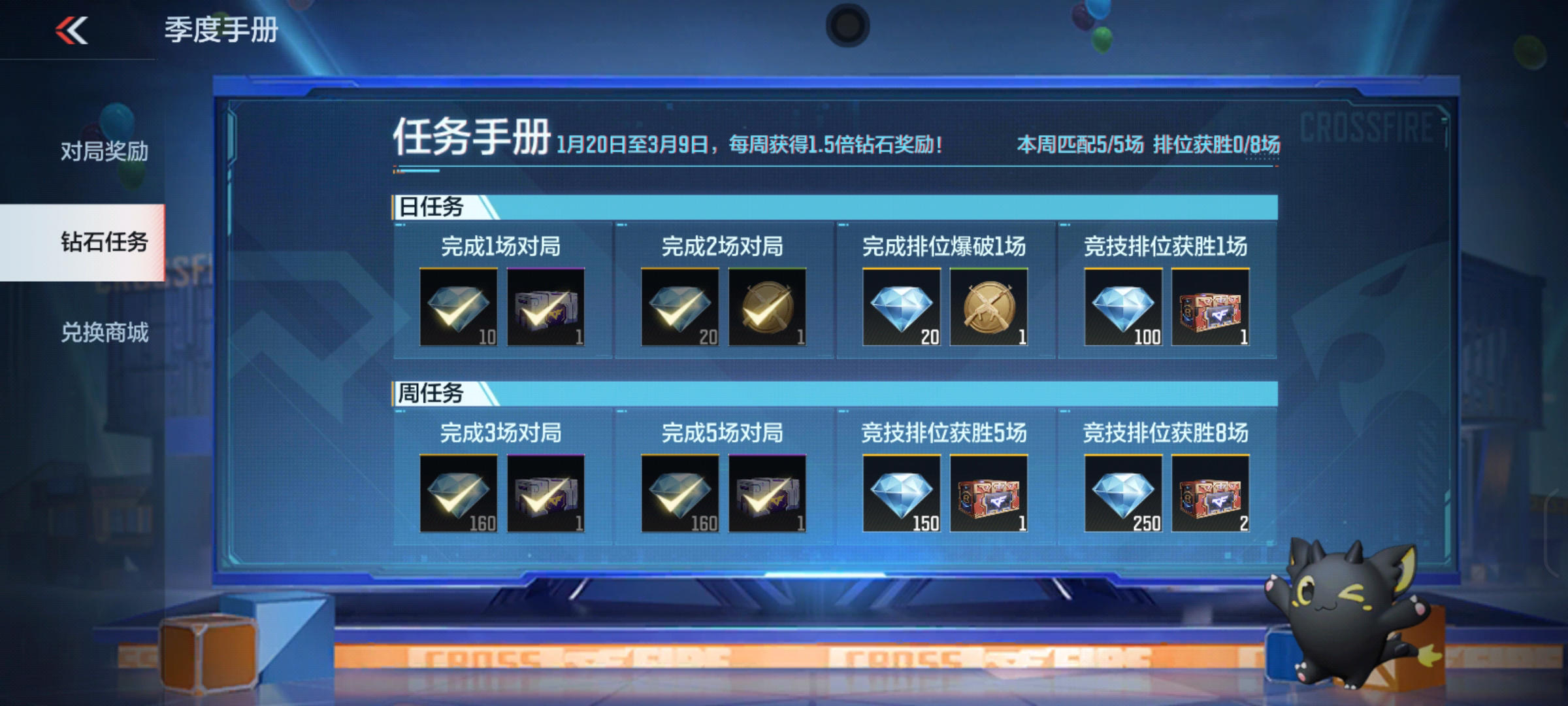 ②每周每日任务减负优化。除了上文提到的任务积分获取优化,季度手册中的排位每周每日任务也做了改动。改动后的钻石任务界面更加简洁明了,任务的内容也由难转易。例如以前的排位获2胜和排位首胜等任务也变为了完成任意对局等简单任务。