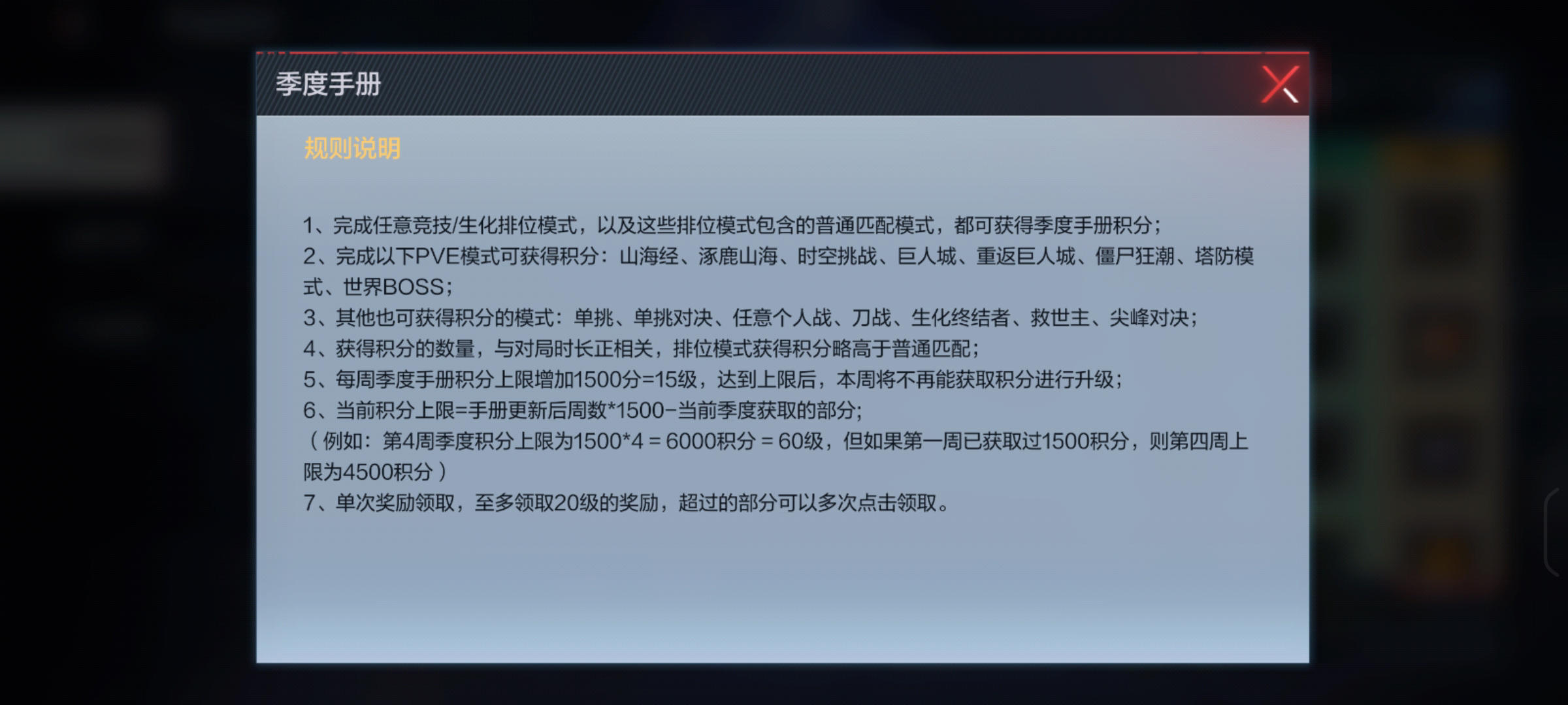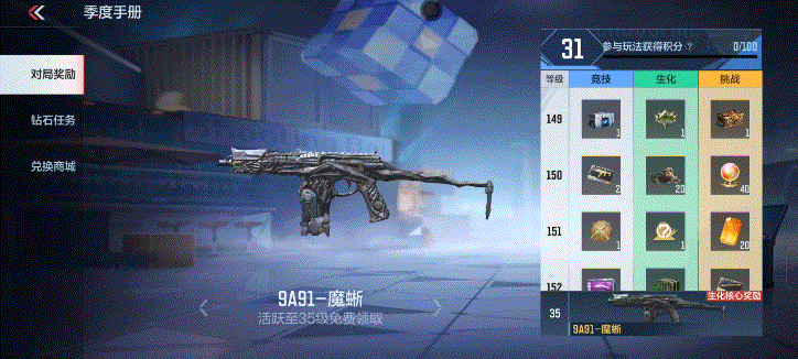 ①任务线与系统入口整合。版本更新前的生化、排位、挑战三种模式的任务相互独立,要想获取全部奖励就需要玩家体验这三种模式,十分地耗时耗力。而现在的季度手册改为了参与任一玩法均可获取任务积分,我们获取的积分数量与对局时长成正相关。如此一来,不仅减少了玩家的任务负担,还能让大家选择自己喜欢的模式进行游玩,可谓是一举两得。