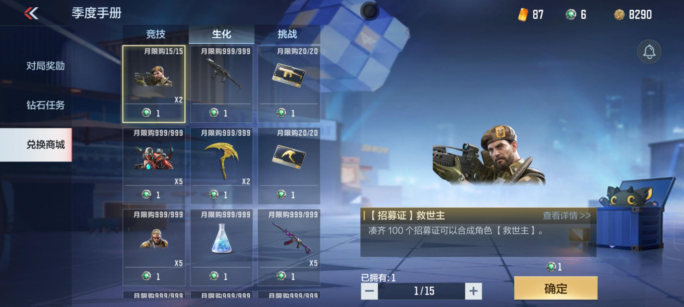 当我们提升一定等级后还能获得赛季大奖角色救世主的招募证。该角色自带“防雷、防摔、生化移速提升”等强力技能,据说还能和幽灵刀锋一样在未来的版本中开放觉醒。此外在兑换商店中还有大量的挑战武器碎片等你来兑换。由此可见,本期的季度手册奖励还是挺丰富的。
