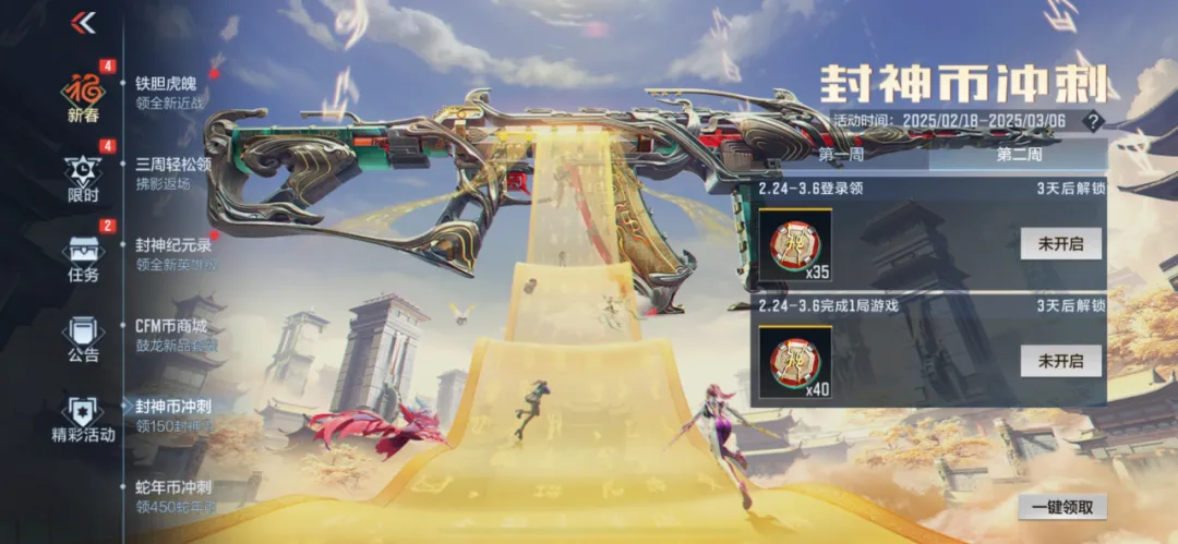 蛇年CFM币冲刺活动第三周于2月24日开启,同样登录完成游戏,即可领取150枚蛇年CFM币!前两周的任务也全部完成的情况下,共计可获得450枚蛇年CFM币。至少可以在蛇年CFM币商城中兑换1款你心仪的道具。