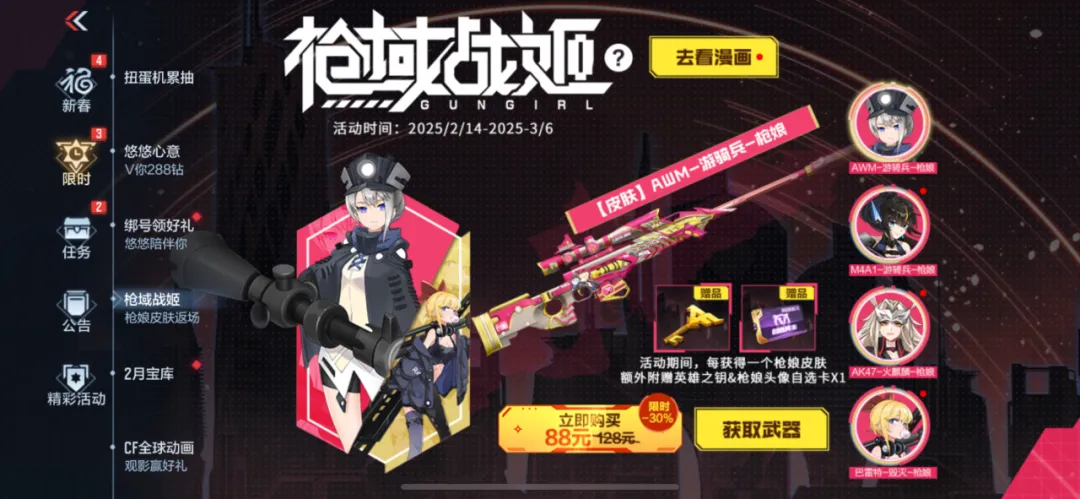 AWM-游骑兵-枪娘首发,M4A1-游骑兵-枪娘、巴雷特-毁灭-枪娘以及AK47-火麒麟-枪娘返场!限时-30%折扣,每获得一个枪娘皮肤额外附赠英雄之钥和1张枪娘头像自选卡。感兴趣的CFer不要错过啦!