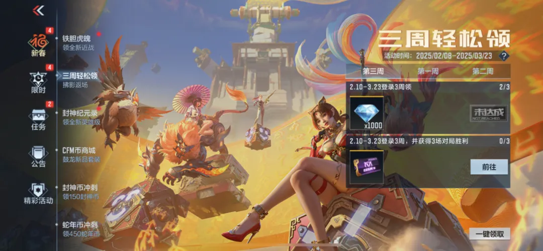 三周轻松领活动正在进行中,只需登录完成对局,即可领取3000钻石、81式-光明之神-三足金乌、轻松领活动角色自选卡:可从云悠悠-心动起点、奥妹、赛丝、斯薇特中选取一个以及轻松领活动武器自选卡:可从沙鹰-神兵修罗、M14EBR-拂影、蝴蝶刀-天神中选取一个。三周轻松领,领取奖励轻轻松松!