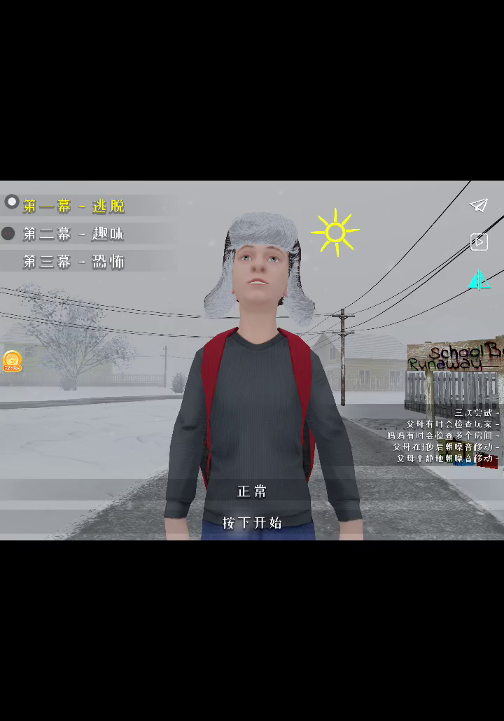 12月30日最新版本0.453已更新~ 【更新内容] 新模式:水平镜像模式。 错误修复。 【如何设置中文】 进入游戏后-点击右上角暂停-点击中间的设置按钮-点击English-选择中文-即可设置中文 游戏目前只解锁第一章~后续章节正在开发中~ “啊,你这个流氓!快点学习!”父母这么说着并把你软禁起来。试着比你的父母更聪明,找到与你的朋友一起出去玩的方法。 沉浸在一个因在学校成绩不好而受到父母惩罚的小学生的角色中,尝试在不被父母发现的情况下逃出家门。 关键机制: - 3D 第一人称游戏。 - 潜行,隐藏,不要被抓住,也不要发出声音! - 拼图,解决谜题,寻找物品来计划你的逃生。 - 小心,父母可能会注意到打开的柜子和门。