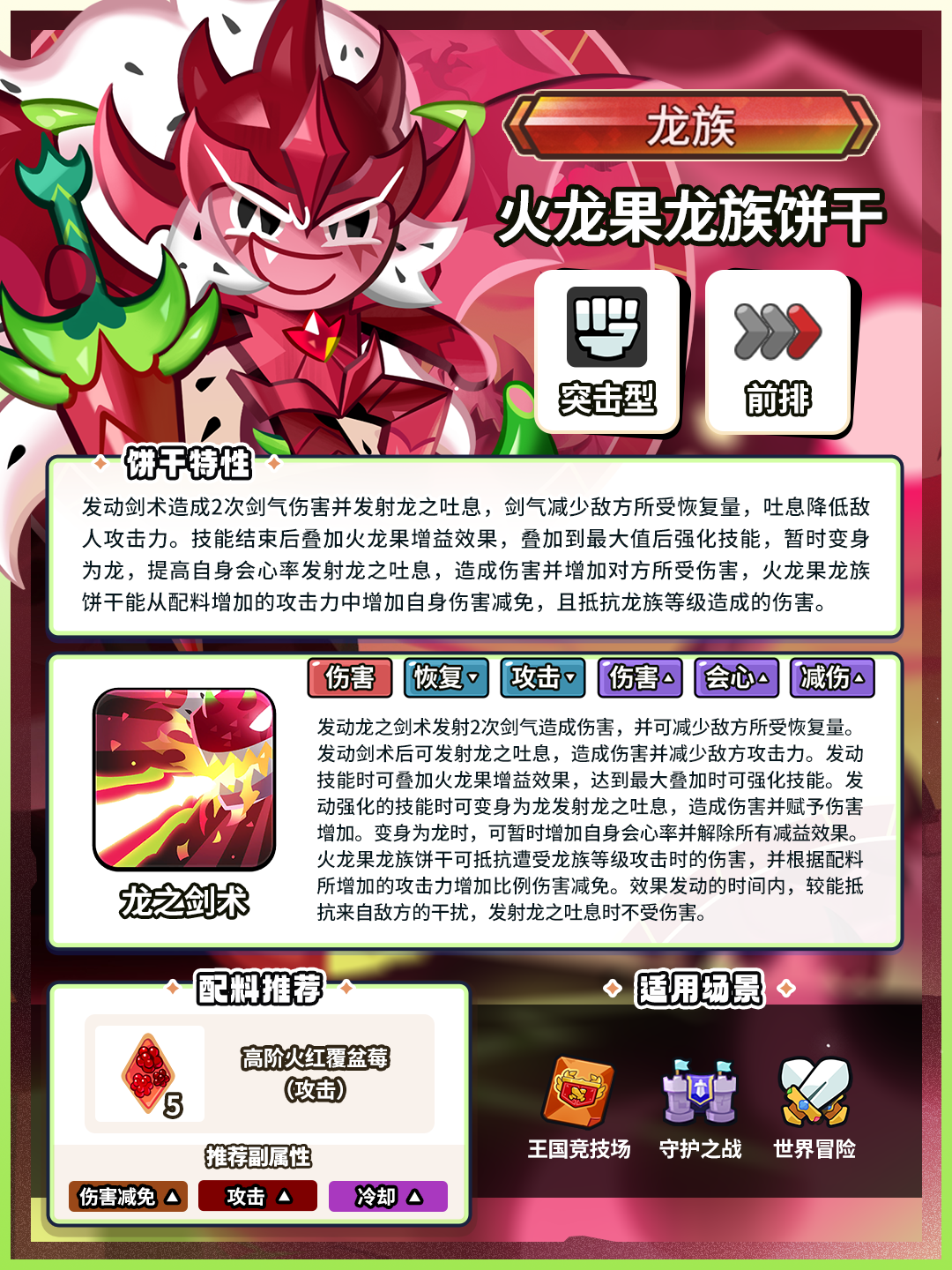 发动剑术造成2次剑气伤害并发射龙之吐息,剑气减少敌方所受恢复量,吐息降低敌人攻击力。技能结束后叠加火龙果增益效果,叠加到最大值后强化技能,暂时变身为龙,提高自身会心率发射龙之吐息,造成伤害并增加对方所受伤害,火龙果龙族饼干能从配料增加的攻击力中增加自身伤害减免,且抵抗龙族等级造成的伤害。