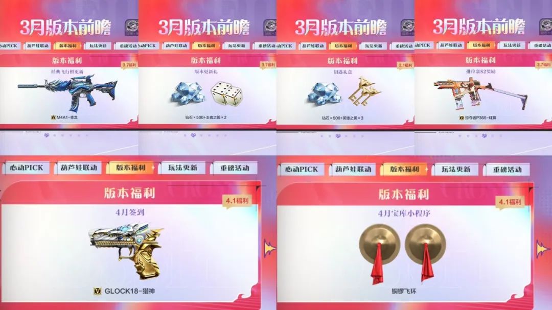 经典飞行棋更新终极奖励自选卡,新增英雄级武器M4A1-青龙,至此,四大神兽武器全部上架飞行棋!并且还有钻石×500和王者之骰×2的版本更新礼在等着大家,助力小伙伴们更快拿下新武器,钥匙礼盒里的钻石×500和英雄之钥×3也不要忘记哦。排位赛S2奖励掠夺者P365-虹舞同时上线,上赛季溢出的觉醒石可以帮助小伙伴们快速觉醒。4月月签将会上线造型帅气的CLOCK18-猎神,并且同期的小程序还会上线“铜锣飞环”,小伙伴们期待一下吧。