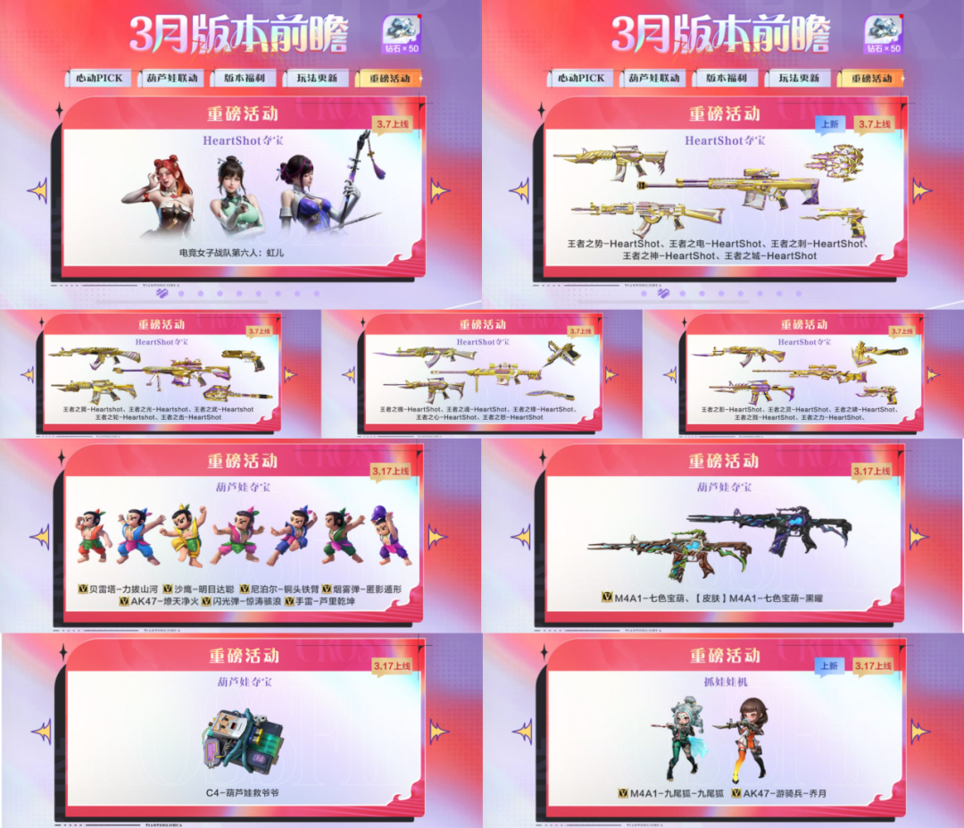 3月7日也就是版本更新当日,HeartShot夺宝第4期如约而至,首发各位CFer的新老婆——虹儿,以及势、城、神、电、刺的女团皮肤。除此以外,还会返场前三期所有的女团皮肤!3月17日将会上线葫芦娃夺宝,返场M4A1七色宝葫和它的黑曜皮肤以及葫芦娃系列的金V武器,还有终极品质的C4-葫芦娃救爷爷。同时,抓娃娃机活动也会在当天上线,新增M4A1-九尾狐-九尾狐,AK47-游骑兵-乔月,这也太可爱了吧,掌中宝武器喜+2!并且还会返场M4A1-游骑兵-香香!