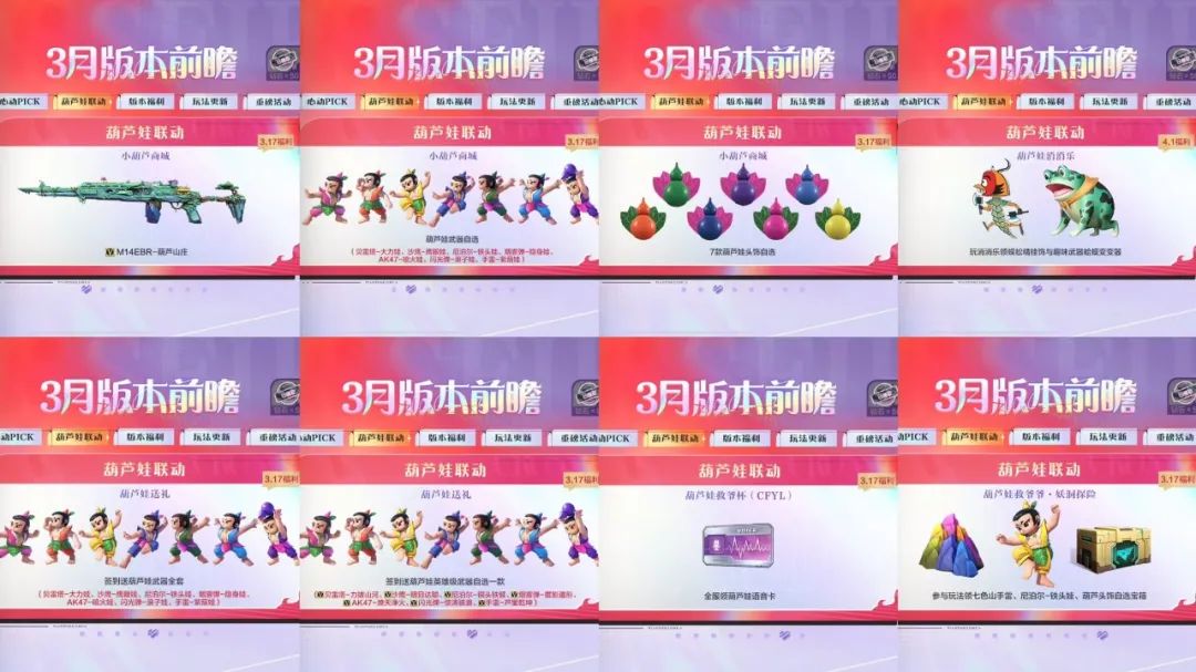 “葫芦娃救爷爷”也是许多小伙伴们开玩笑的口头禅了,这不,CFer们心心念念的联动活动来了,首发M14EBR-葫芦山庄!小葫芦商城可以兑换葫芦娃武器的铜v版本和葫芦娃头饰,葫芦娃消消乐趣味小游戏还可以领取蜈蚣精挂饰和蛤蟆变变器。最重要的是,签到送葫芦娃武器铜V全套以及葫芦娃英雄级武器自选一款,不知道大家最心仪的武器是哪款呢?同时全服都可以领取葫芦娃救爷杯(CFYL)活动送的一张葫芦娃语音卡哦!并且参与玩法可以领取七色山手雷、尼泊尔-铁头娃、葫芦头饰自选宝箱等道具!