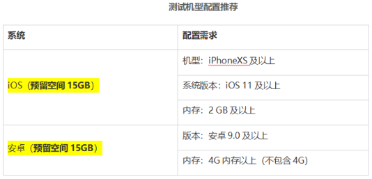 测试机型配置推荐:预留空间15GB,版本:安卓9.0及以上,内存:4G内存以上(不包含4G)