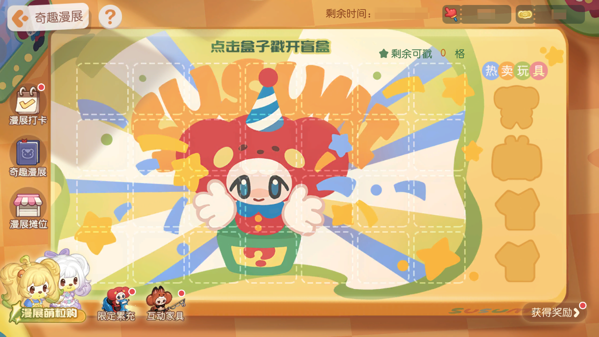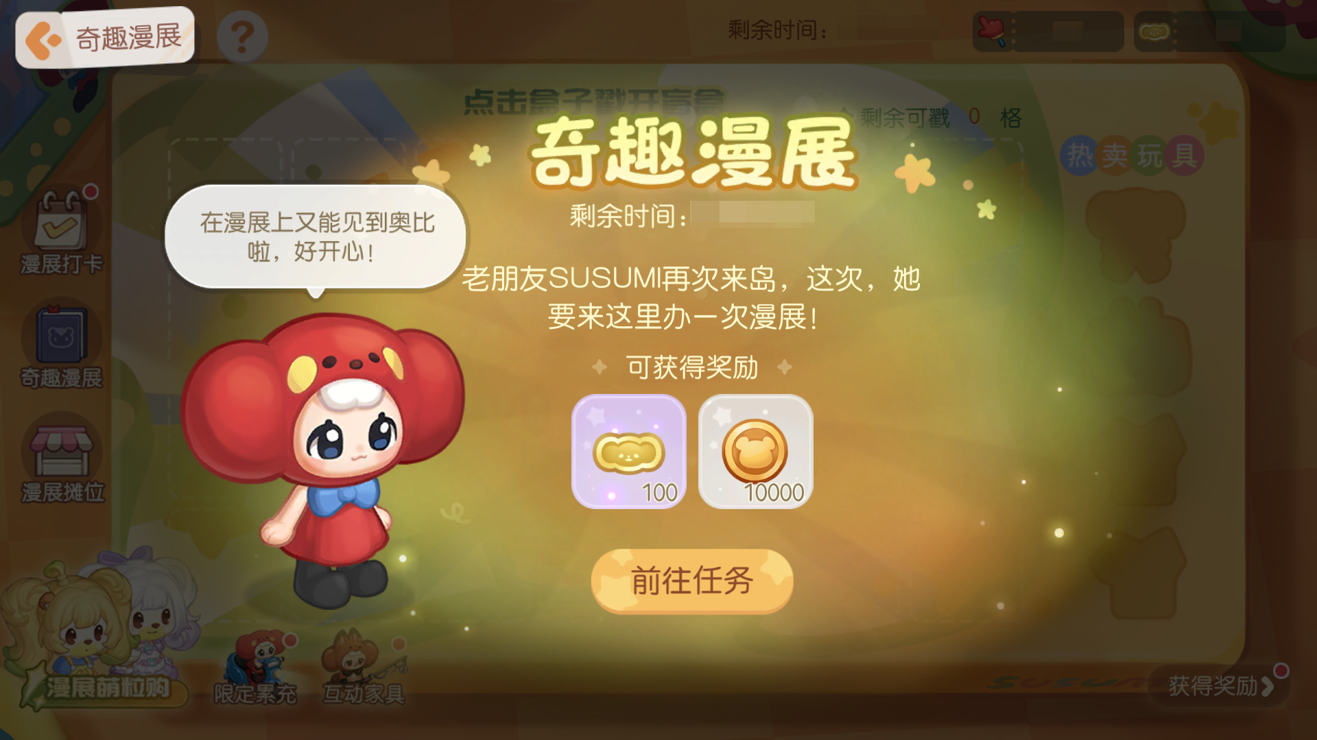 活动介绍:漫展的小游戏摊位,戳开纸盒上的小洞,找到SUSUMI藏在盒子里的玩具吧!活动期间,参与「趣漫展」系列活动,可以获得珍稀道具,更有限时主题时装家具等你来拿。