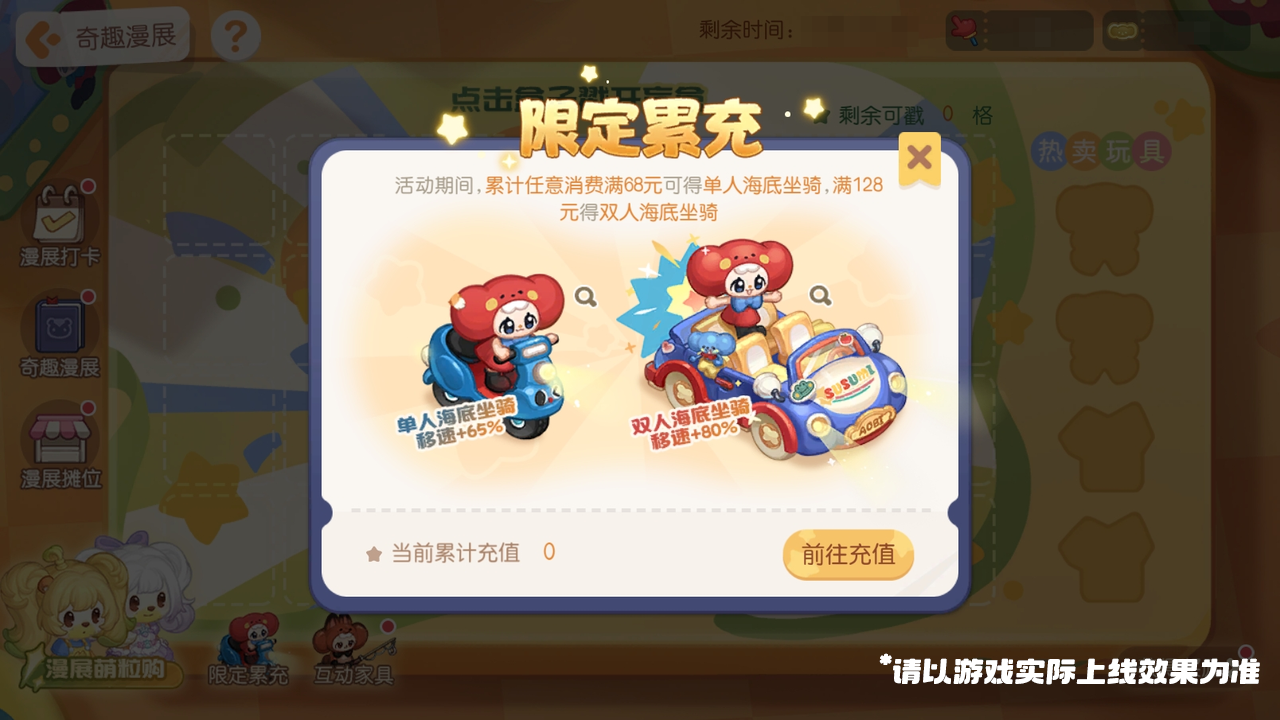 活动介绍:活动期间,累计任意消费满68元可得单人海底坐骑「酥酥米摩托坐骑」,累计任意消费满128元可得双人海底坐骑「酥酥米汽车坐骑」。