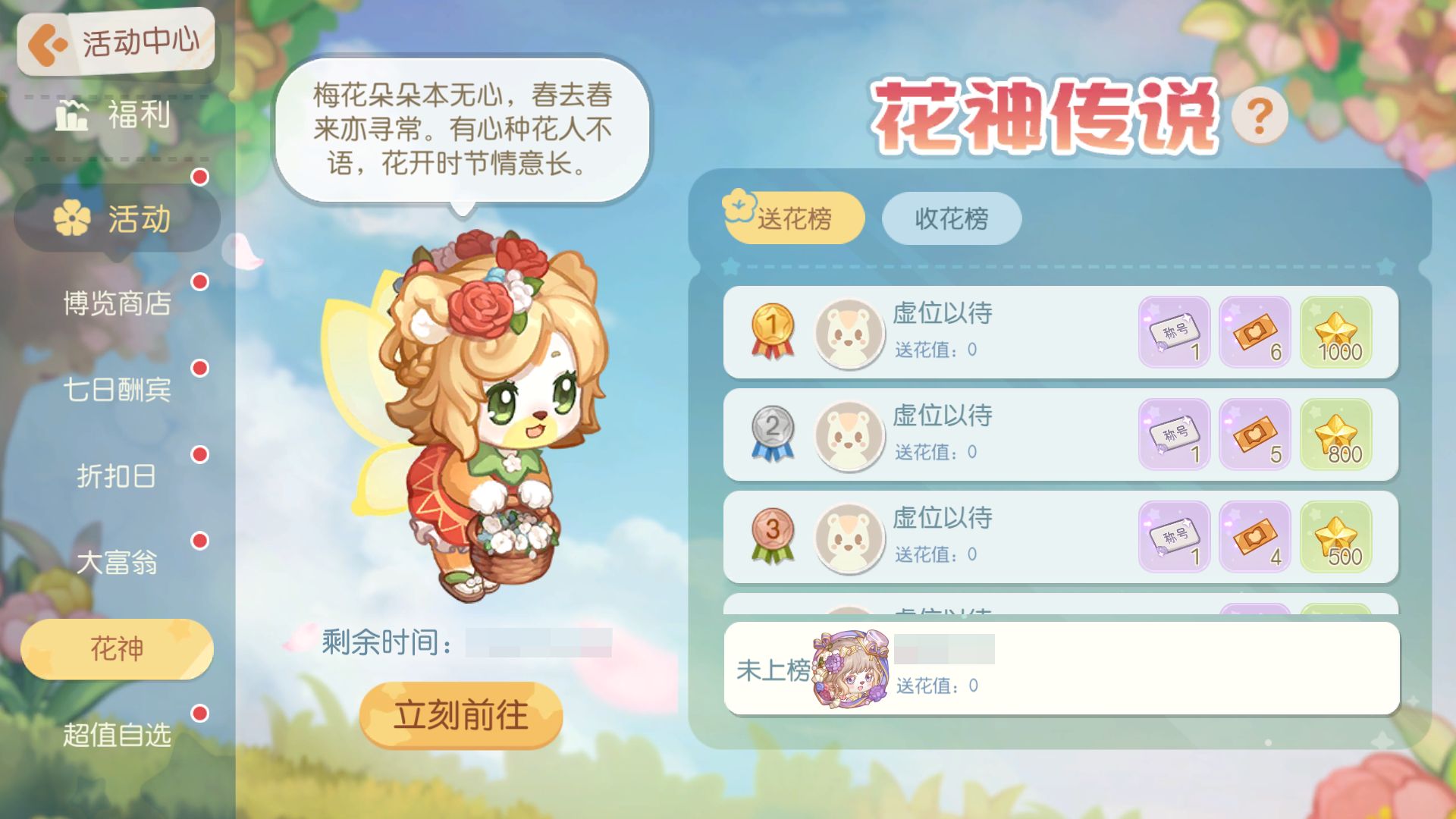 活动介绍:花开时节情意长,沉睡在百花园中的花神已经醒来。前来收集材料,制作花神最爱的花束,将其赠与心仪之人吧。活动期间,送花、收花达到排名条件奖励,即可获得对应的排名奖励物品噢。