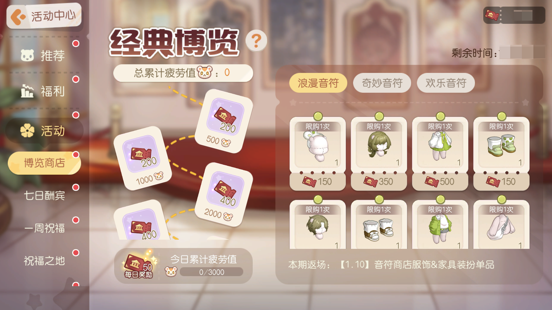 活动介绍:奥比们期待的兑换商店返场来啦!活动期间,小奥比们可通过劳作、采伐、挖矿、钓鱼等行为累积疲劳值获得「博览门票」,使用「博览门票」即可在「博览商店」中兑换往期主题商店的服饰、家具等物品。本期开启「音符商店」服饰和家具的兑换,喜欢的小奥比们可不要错过哦!
