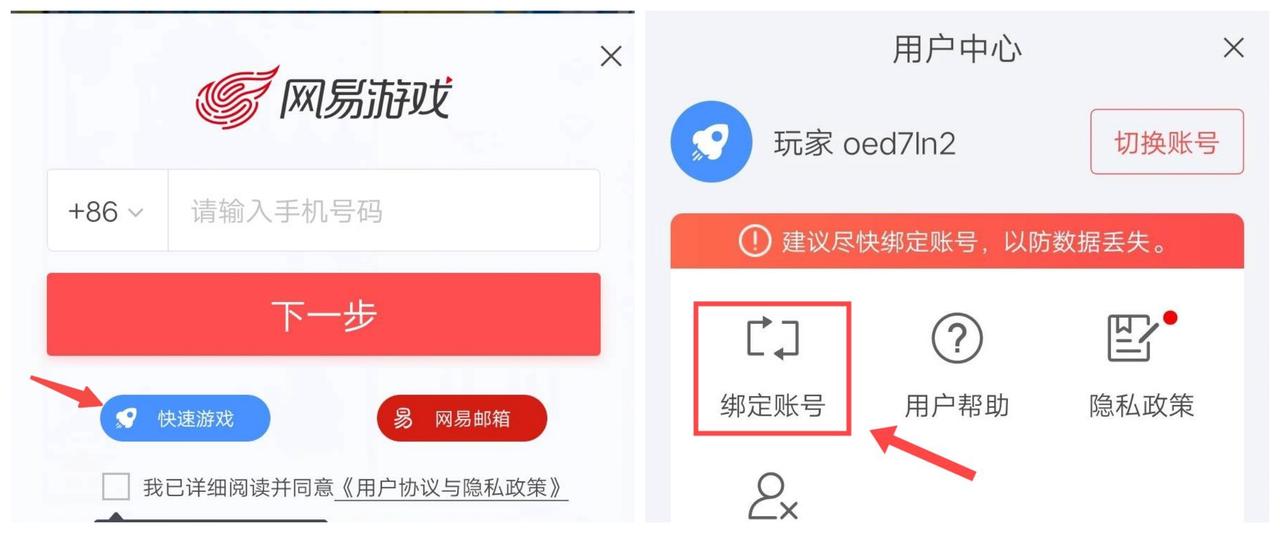 注意注意:该方法注册的玩家记得前往<用户中心>(点击右上角账号图标),进行绑定账号关联,可选择关联手机号绑定或网易邮箱的方式。快速注册在游戏被删除后可能导致账号无法找回,切记及时进行绑定,防止游戏进度丢失。