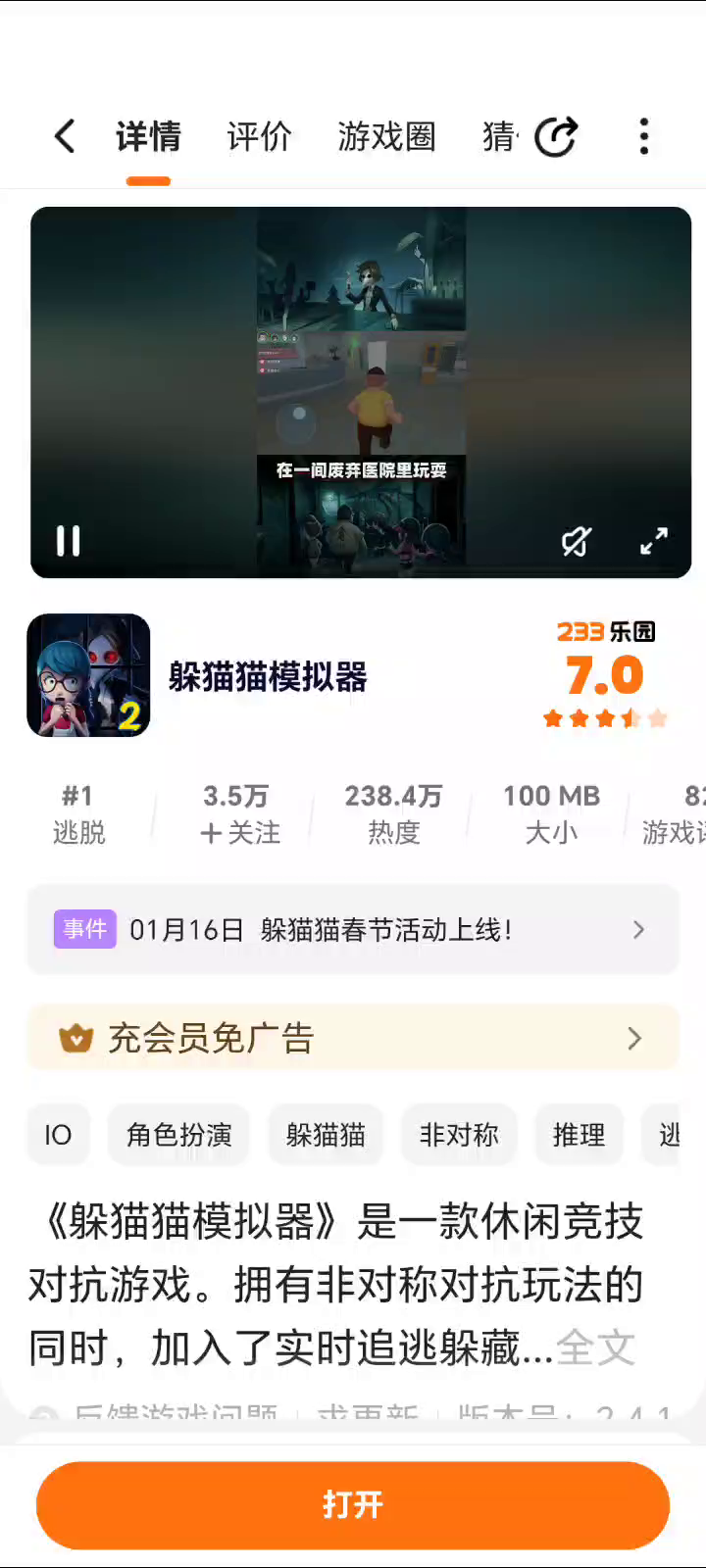 《躲猫猫模拟器》是一款休闲竞技对抗游戏。拥有非对称对抗玩法的同时,加入了实时追逃躲藏玩法。强化了实时互动对抗性。游戏模式也延续一代的躲藏者与抓捕者双模式,让玩家体验两种不同的乐趣。4V1的逃脱者模式,让4个逃脱者联合起来一起对抗boss,寻找宝石打开医院大门逃脱。在游戏中可以体验到实时竞技对抗与敌人斗智斗勇的乐趣,也可以感受到画面音效对恐怖氛围的渲染,让玩家感受全新的心跳体验。多变的策略玩法,丰富的角色道具选择,都让游戏更加经久耐玩令人回味无穷!